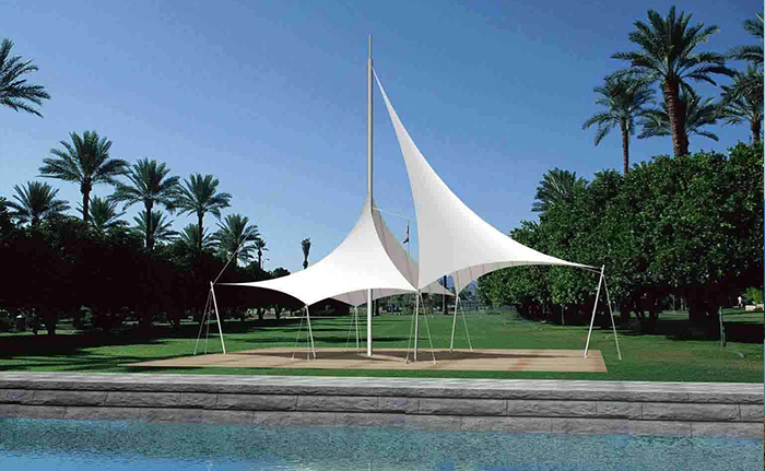 以膜材、鋼索及支柱構(gòu)成,利用鋼索與支柱在膜材中導(dǎo)入張力以達(dá)到安定的形式。除了可實(shí)踐具創(chuàng)意,創(chuàng)新且美觀的造型外,也是能展現(xiàn)膜結(jié)構(gòu)精神的構(gòu)造形式.近年來,大型跨距空間也多采用以鋼索與壓縮材料構(gòu)成鋼索網(wǎng)來支撐上部膜材的形式。因施工精度要求高,結(jié)構(gòu)性能強(qiáng),且具豐富的表現(xiàn)力,所以造價(jià)略高于骨架式膜結(jié)構(gòu)。